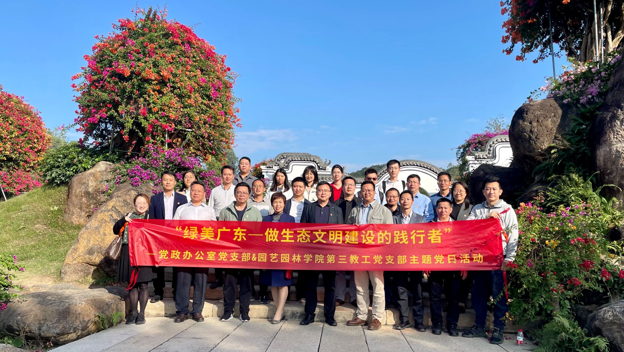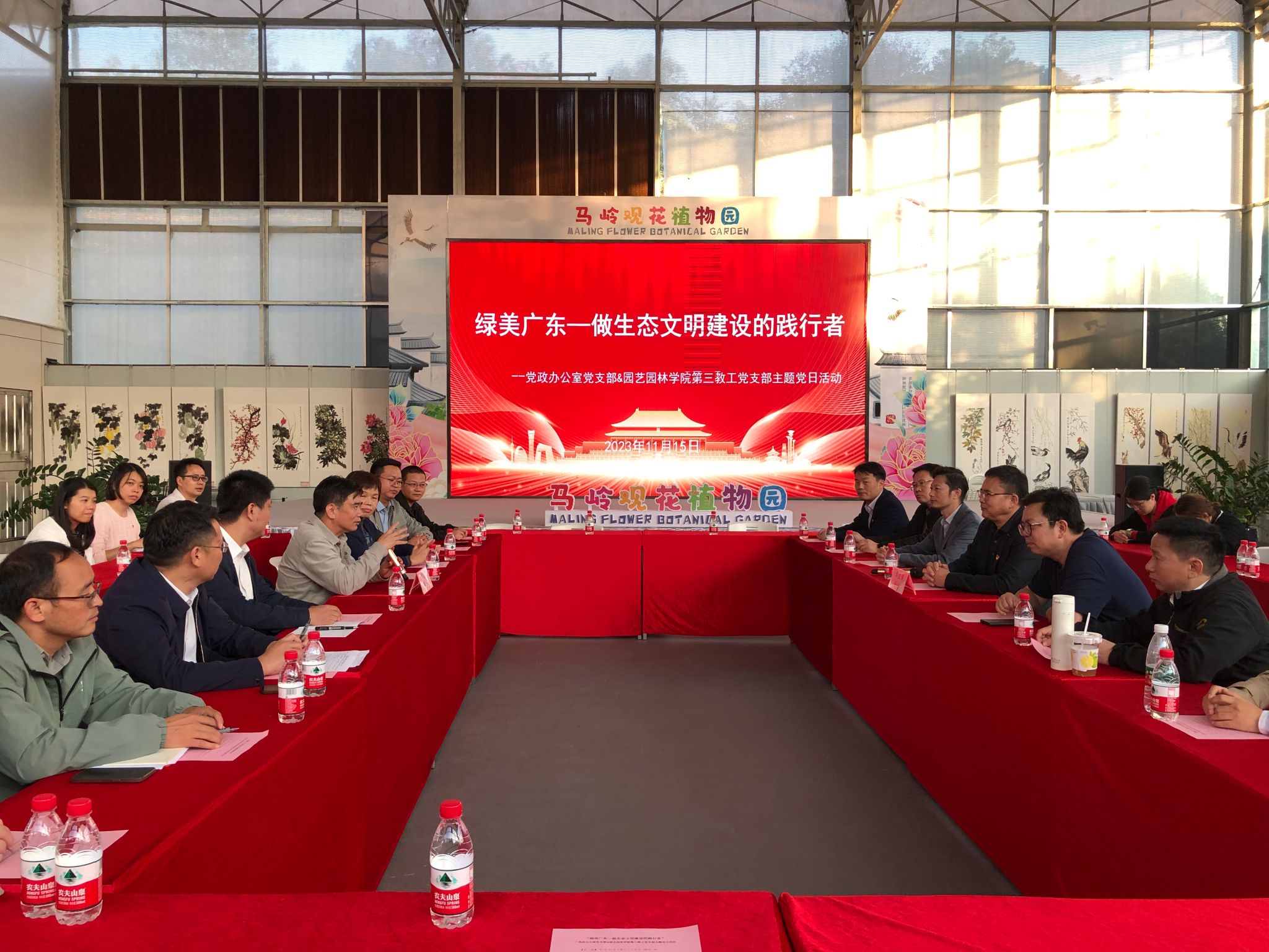 为深入学习贯彻习近平生态文明思想,落实党支部全面结对共建工作,11月15日下午,学校党委书记宋垚臻参加由党政办公室党支部与园艺园林学院教工第三支部结对共建共同开展的“绿美广东——做生态文明建设的践行者”主题党日活动。园艺园林学院党委委员,广州花卉之都农业有限公司董事长郑志民、花都马岭观花植物园相关负责人以及两个党支部全体党员等参加活动。