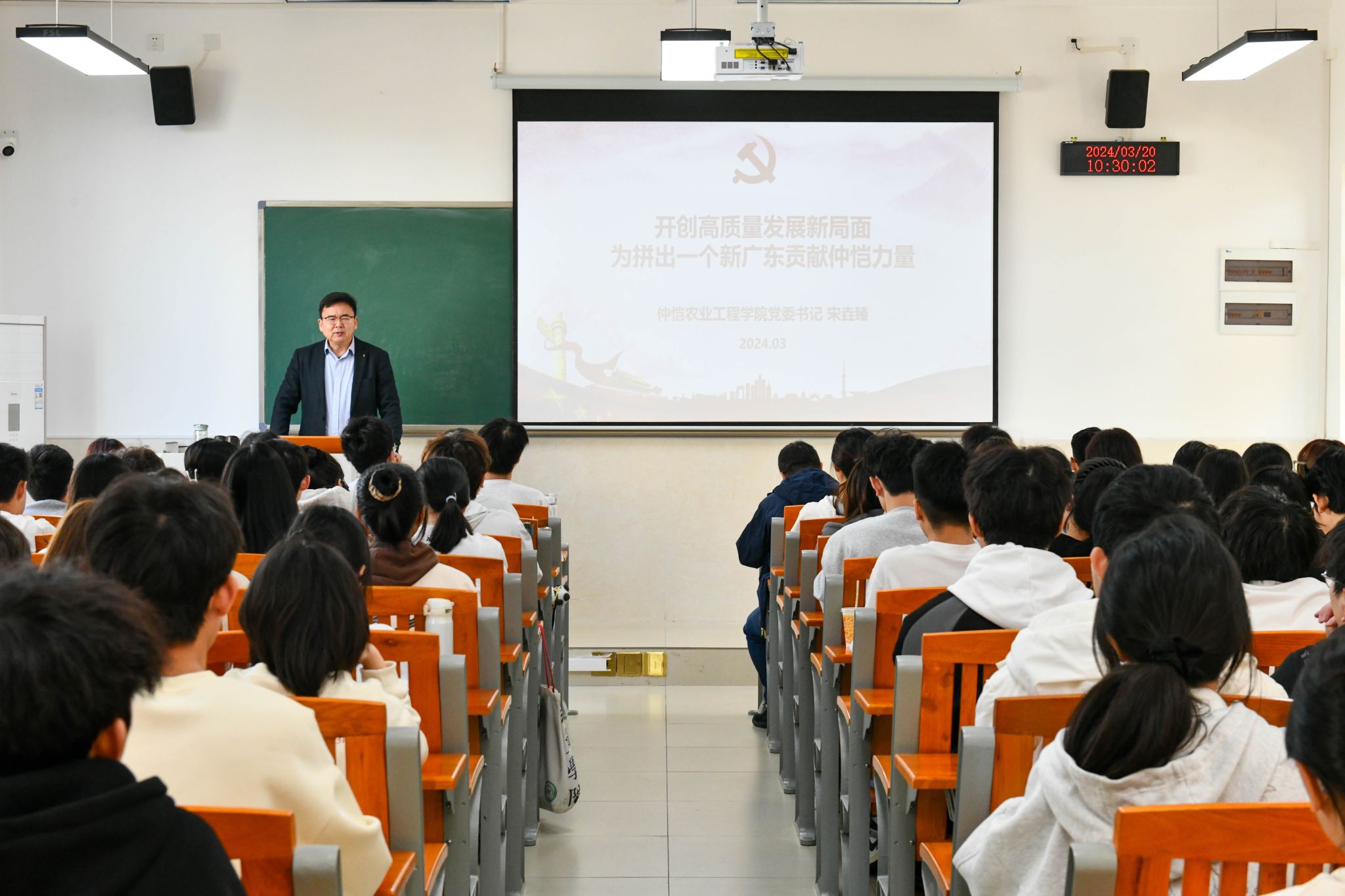 3月20日上午,校党委书记宋垚臻教授以“开创高质量发展新局面 为拼出一个新广东贡献仲恺力量”为题,在白云校区为国贸231-233班同学们讲授2024年春季学期“思政第一课”,带领同学们深入学习习近平总书记在全国两会的重要讲话精神,准确把握高质量发展和新质生产力的内涵要义。