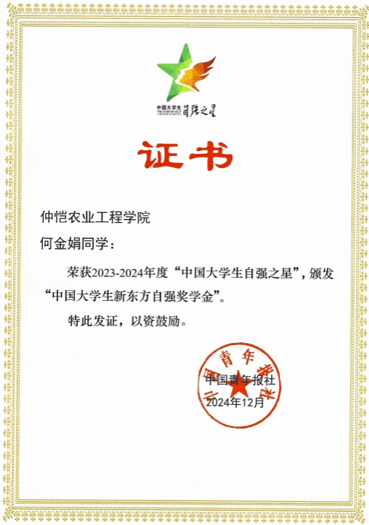 近日,共青团中央、全国学联揭晓2023-2024年度“中国大学生自强之星”评选结果,我校何金娟、林郁两位学子凭借扎根基层的坚守与创新创业的魄力双双摘得殊荣。他们以行动诠释了“注重实践,扶助农工”的校训精神,展现了新时代仲恺青年将个人理想融入国家发展的使命担当。
