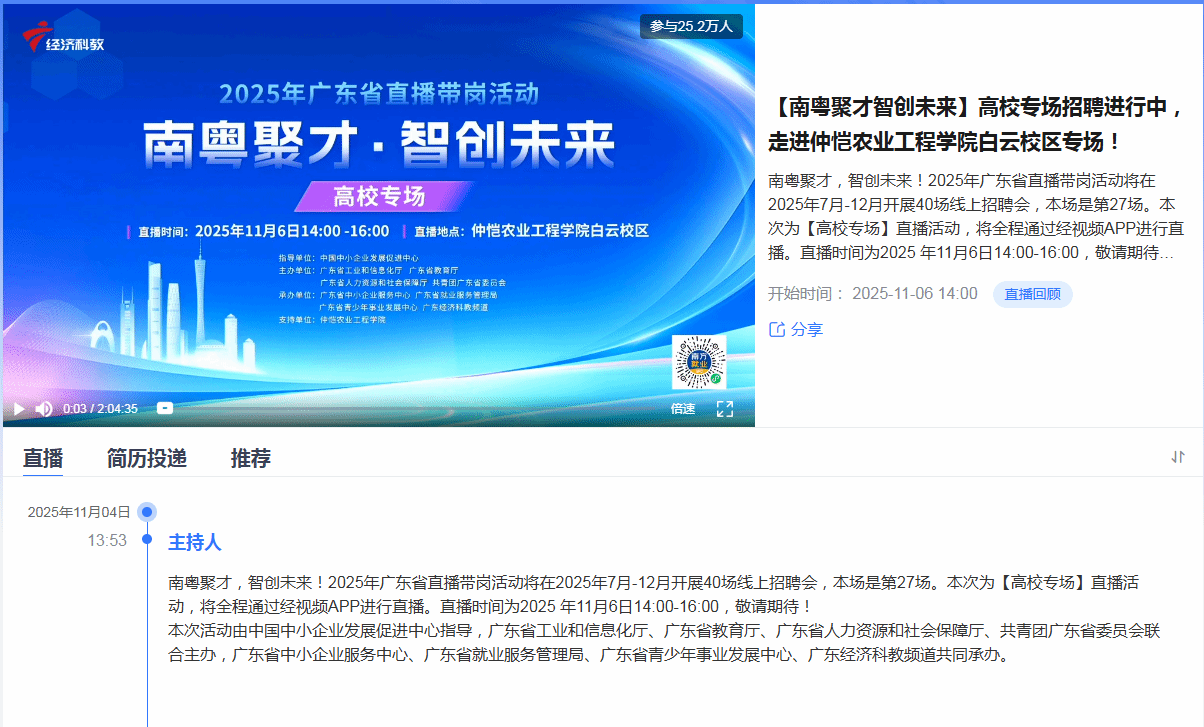 活动现场设立二级学院校企合作咨询点、征兵入伍咨询区、就业创业指导专区向毕业生提供政策宣讲和就业指导,同时专设功能区为毕业生提供简历打印复印、医疗保障等暖心服务。学校组织各二级学院领导、毕业班辅导员等到现场,积极对接企业建立合作联系,同时为毕业生解答求职过程中遇到的各项疑惑,为毕业生顺利就业保驾护航。活动同时依托广东经济科教平台进行现场直播,共吸引了包括周边多所高校的近5000名毕业生到现场求职应聘,达到了较好的辐射效果。此次招聘会也开展了【南粤聚才智创未来】高校专场2025年广东省直播带岗活动,依托广东经视、21财经、经视视频三大平台同步直播,我校“仲恺追梦园”视频号也同步转播,直播间共吸引了近38.4万人观看。
