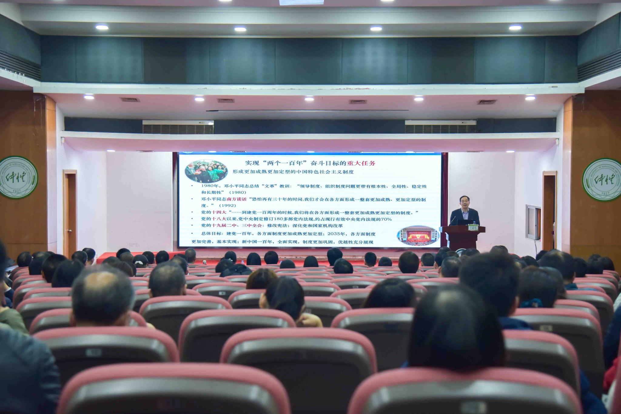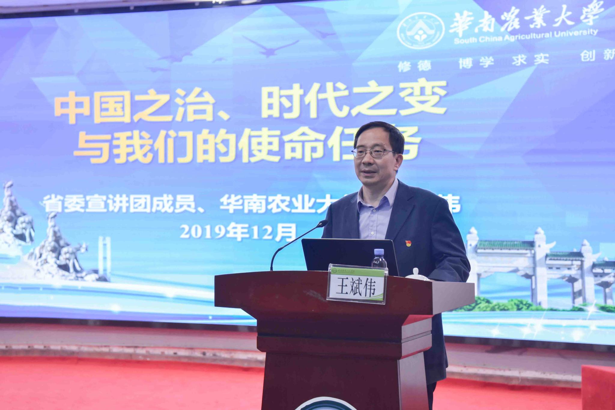 根据省委部署要求和学校工作安排,12月24日,学校在海珠校区学术报告厅召开党的十九届四中全会精神宣讲会。学习贯彻党的十九届四中全会精神省委宣讲团成员、华南农业大学党委书记王斌伟应邀作专题讲座。学校领导、全体科级及以上干部共200余人参加会议。会议由党委书记宋垚臻主持。