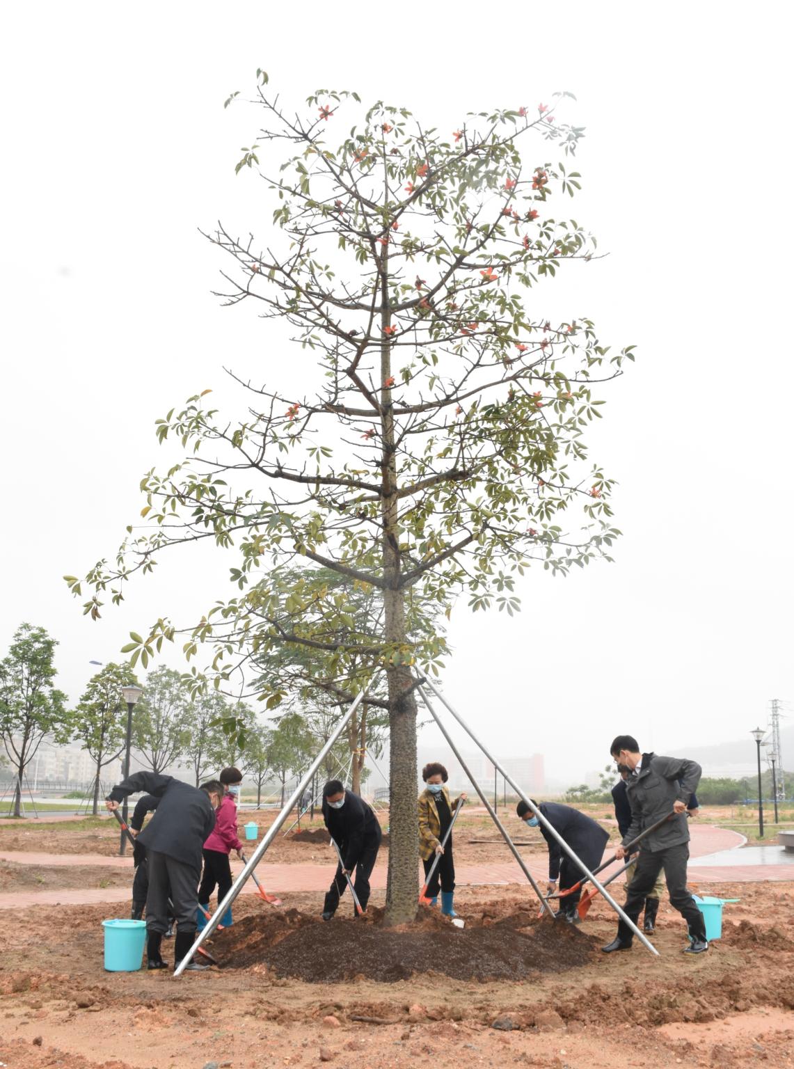 春日迟迟,校园菁菁。在全国抗击新冠肺炎疫情取得阶段性成效、经济社会秩序逐步恢复正常的关键时刻,仲恺农业工程学院在白云校区举行了一场别开生面的植树活动。全体校领导和捐赠树木的校友企业嘉宾、广州市花木公司总经理康毅全先生以及相关职能部门、二级学院负责人一道扶苗填坑、挥锹培土、浇水灌根,为美丽的仲园添上新绿。