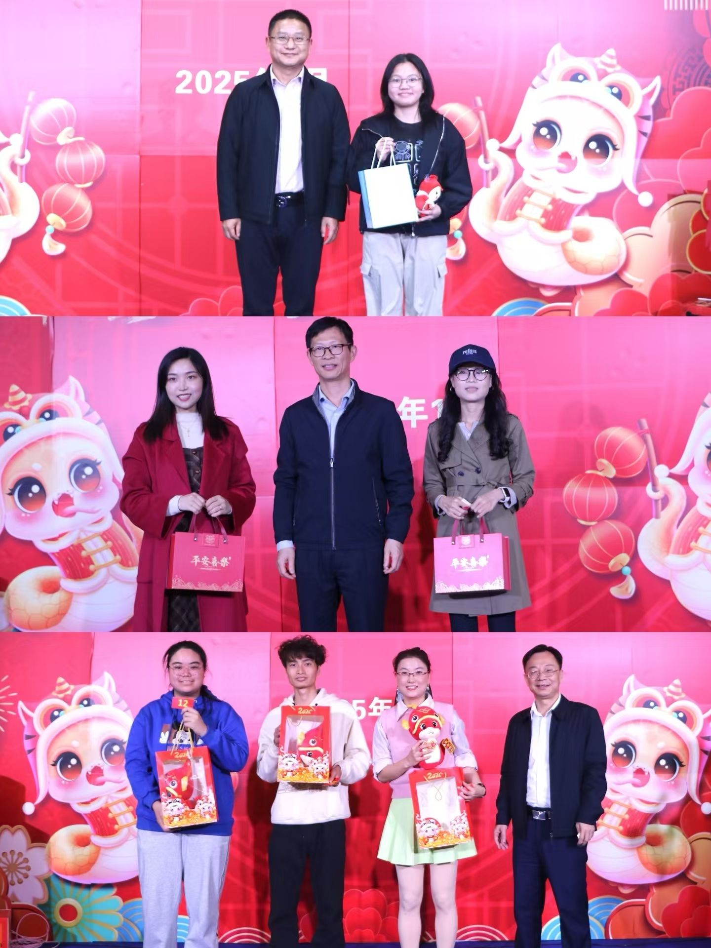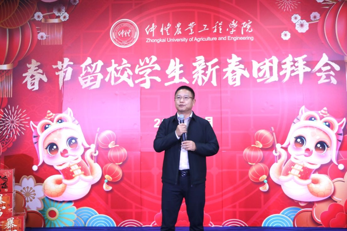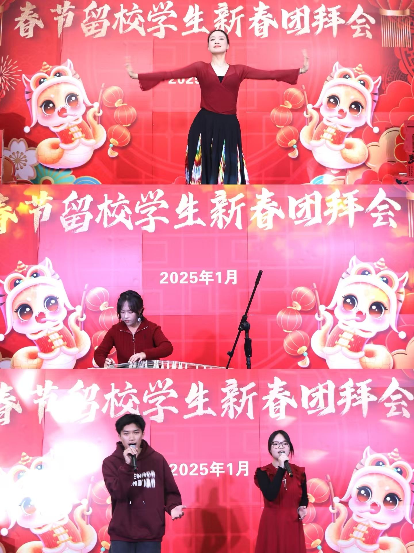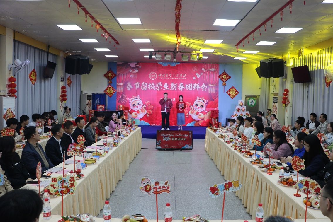 灵蛇献瑞贺新春,同心聚力启新程。1月24日下午,学校在海珠校区学生舞厅举办2025年寒假留校学生新春团拜会,师生同聚一堂,欢度蛇年春节。学校党委副书记、校长廖明,党委副书记朱立学,学生工作党委书记李伟东,党政办副主任兼法制办主任邱振国,学生工作党委副书记、学生工作部部长沈洁,学校团委书记杨珊珊以及学生工作部、学校团委其他班子成员,二级学院党委副书记、辅导员代表,春节留校学生参加活动。