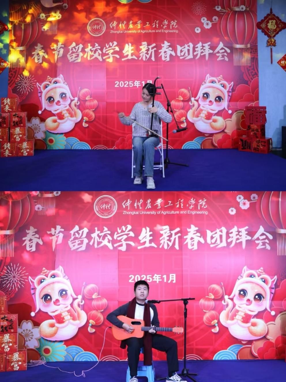 金蛇启新岁,蛇年迈新步。学生工作部熊雪为大家带来二胡演奏《金蛇狂舞》、《彩云追月》,欢快、奔放的旋律让大家沉浸在节日的欢乐之中回味无穷。人文与社会科学学院辅导员赵国英带来吉他弹唱《异乡人》,用琴声诉说异乡人的故事,更添浓浓思乡之情。伴随鼓声响起,热闹有趣的击鼓传花游戏将活动氛围推向高潮,师生同乐,廖明校长现场演唱《光阴的故事》,悠扬的歌声点燃全场,大家一起合唱,感受伟大时代的安宁美好。