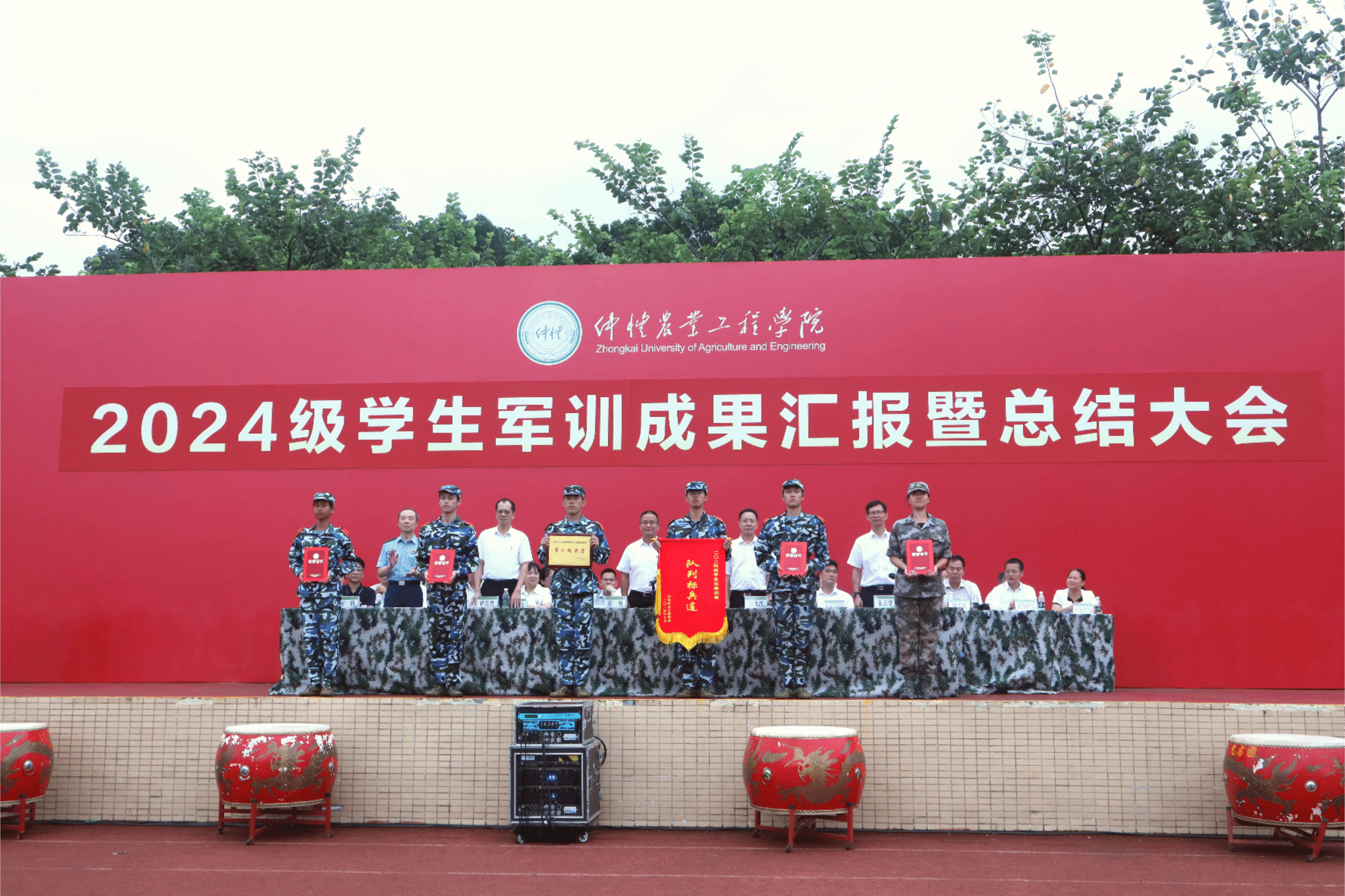 田允波宣读《关于表彰2024级学生军训工作先进集体和先进个人的决定》,校领导分别为军训队列标兵营代表、标兵连代表、内务卫生优秀宿舍代表、军训宣传报道最佳组织奖代表、军训训练先进个人代表、军训工作优秀教官代表等颁奖。