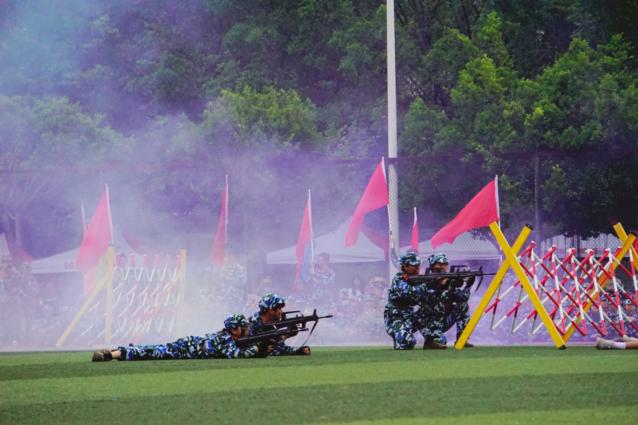 军训成果汇演上,舞旗方阵伴随着恢宏大气的鼓声上场,红旗的破风声在表演中不失气势、舞动人心。警棍盾牌操既展示了同学们熟练的格斗招式,还通过场景还原展示面对突发事件时灵活变换的阵型,一招一式尽展仲恺学子飒爽英姿。千名新生们组成的军体拳方阵,通过日复一日的练习达到了千人同步的壮丽景象,发出了千人怒吼出的口号声,令人赞叹。旗语合唱方阵共同演唱《当那一天来临》和《强军战歌》,团结奋进的精神和炽热的爱国情怀将汇演推至高潮。