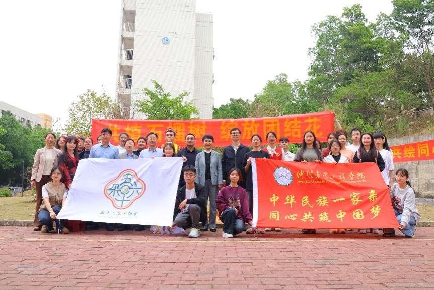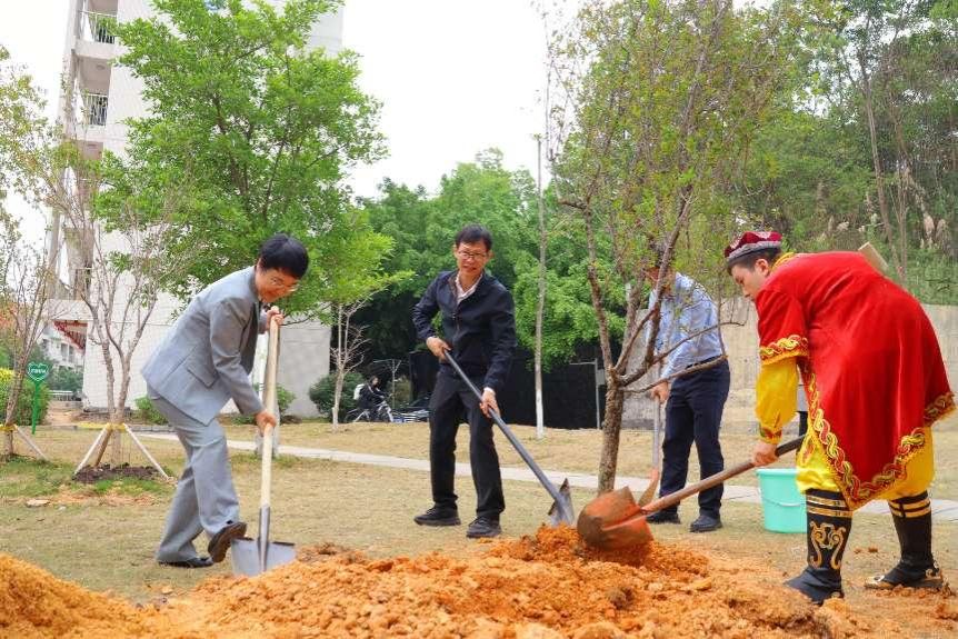 校领导与少数民族学生代表共同种下象征着民族团结的石榴树,寓意各民族之间像石榴籽一样紧紧抱在一起,团结友爱、共同成长。