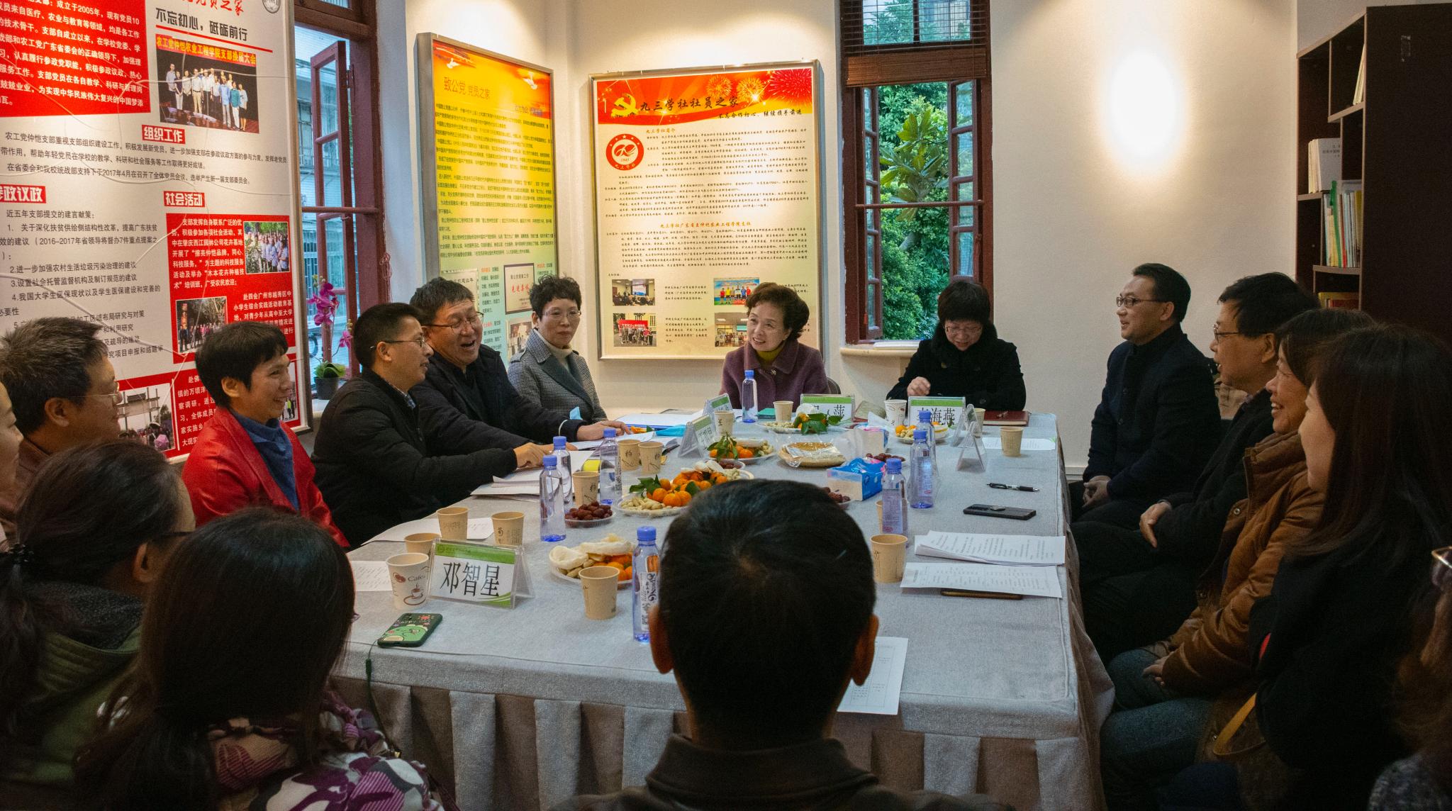 2021年1月13日下午,民革仲恺农业工程学院支部开展党员座谈交流活动。民革中央常委、民革广东省委会主委、广东省政协常委、学校校长程萍,学校党委副书记、纪委书记李海燕,民革省委会组织处处长刘欣梅,学校党委常委、党委宣传部部长、统战部部长曾献尼,党委委员、党委统战部常务副部长何军峰,以及致公党仲恺支部主委蔡马出席座谈。会议由主委王明星主持。